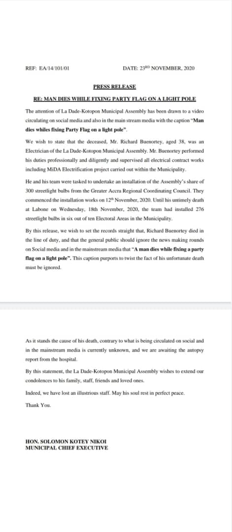 “By this release, we wish to set the records straight that, Richard Buenortey died in the line of duty, and that the general public should ignore the news making rounds on Social media and in the mainstream media that ‘A man dies while fixing a party flag on a light pole’.