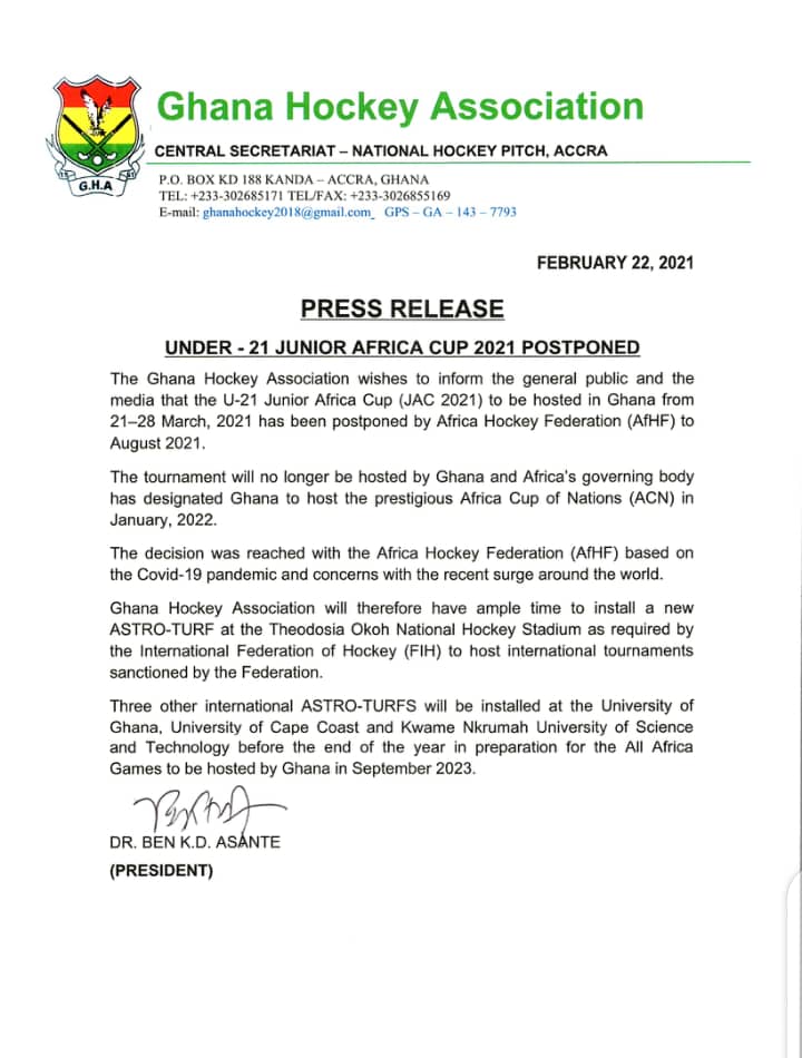 The African Hockey Federation(AfHF) on Thursday announced the cancellation of the 2021 U-21 junior African Cup championship, which was scheduled to have been stagged in Ghana, due to the Covid-19 pandemic that has brought virtually every major event to a standstill.