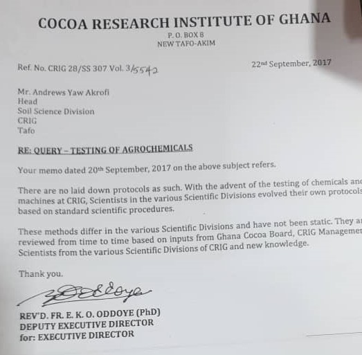 The letter signed by Rev. Fr. E.K. Oddoye, the then Deputy Executive Director of CRIG, which is in evidence as Exhibit H page 73, dated 22nd September, 2017 under the headline “RE: QUERY – TESTING OF AGROCHEMICALS” reads in full: