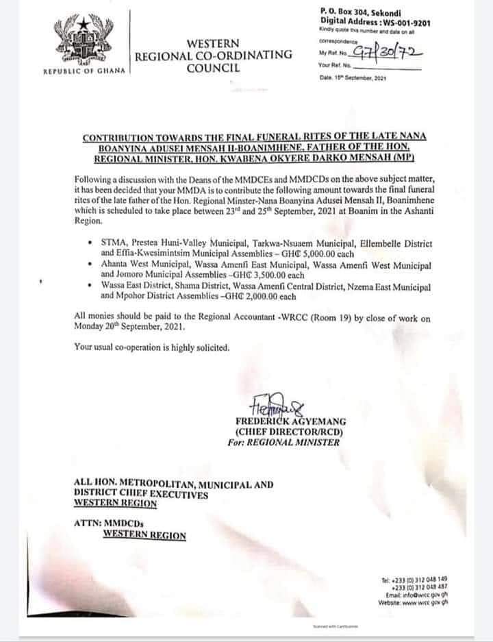 The minister’s reaction follows a letter making rounds on social media with the caption “contributions towards the final funeral rites of the late Nana Boanyina Adusei Mensah II – Boanimhene, father of the Hon Regional Minister, Hon Kwabena Okyere Darko Mensah (MP)”