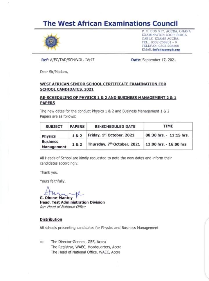 However in a communique signed by Head of Test Administration Division, George Ohene-Mantey, the council said the “Physics paper 1&2 will be written on Friday, October 1, at 8:30 AM whiles Business Management paper 1&2 will be administered on Thursday, October 7, at 1:00 PM.”
