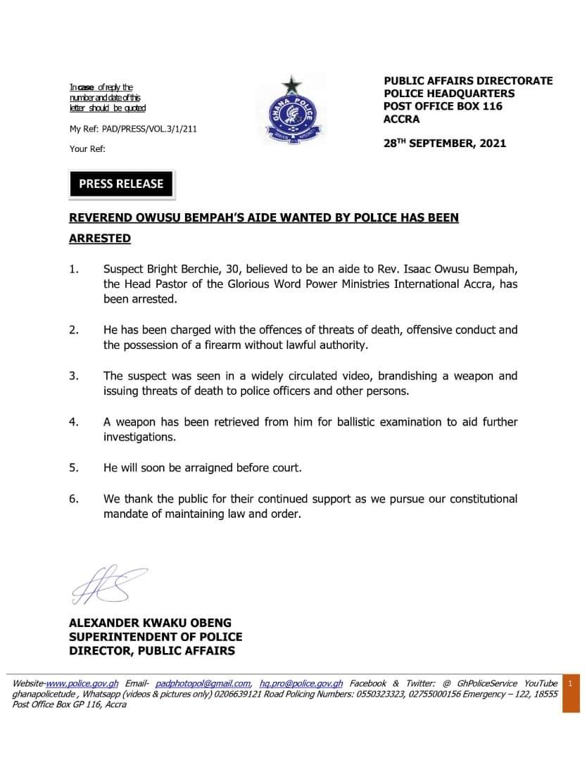 Aide to Founder of Glorious Word Power Ministries International (GWPMI), Reverend Dr. Isaac Owusu Bempah, has been arrested, the Ghana Police Service has announced.