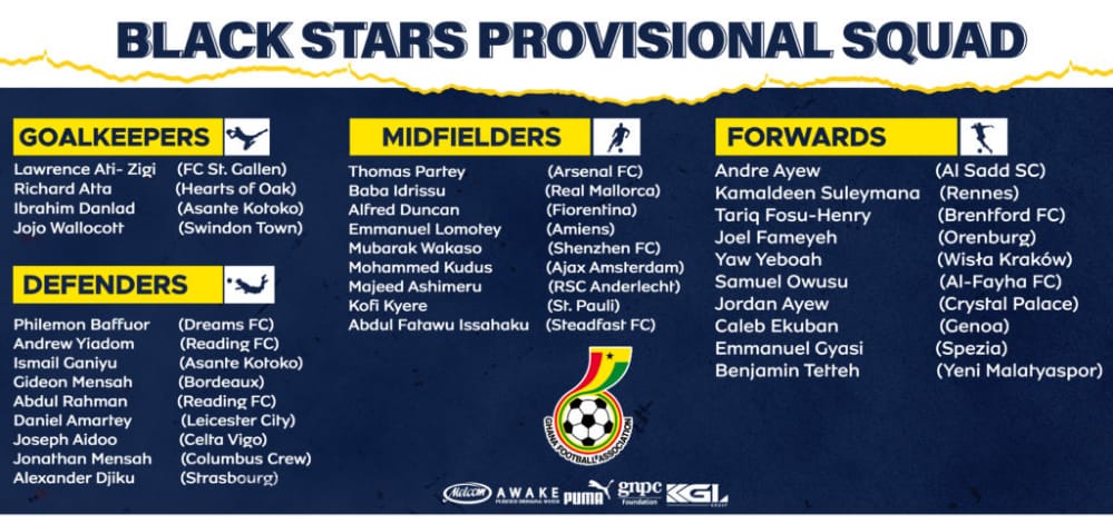 Forwards: Andre Ayew (Al Sadd SC), Kamaldeen Suleymana (Rennes), Tariq Fosu-Henry (Brentford FC), Joel Fameyeh (Orenburg), Yaw Yeboah (Wisła Kraków), Samuel Owusu (Al-Fayha FC), Jordan Ayew (Crystal Palace), Caleb Ekuban (Genoa), Emmanuel Gyasi (Spezia), Benjamin Tetteh (Yeni Malatyaspor)