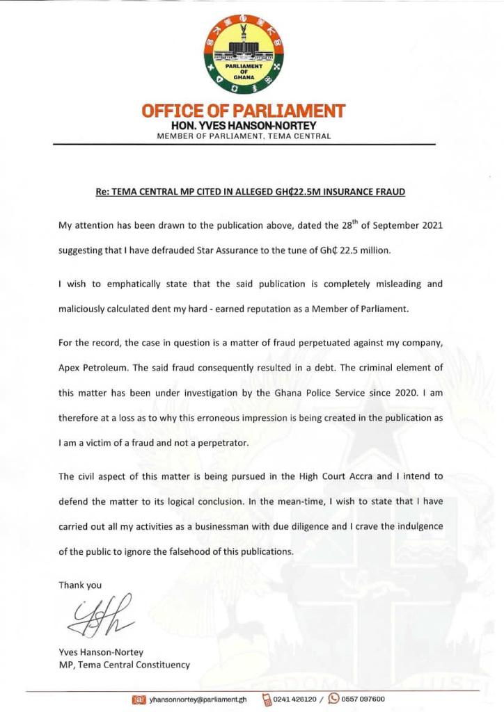 Member of Parliament for Tema Central Constituency, Yves Hanson-Nortey, has debunked allegations about his alleged involvement in a GH₵22.5 million fraud.