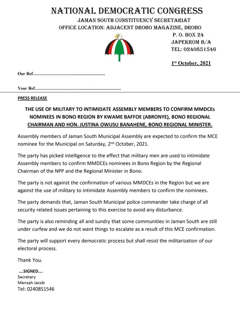 “The party has picked intelligence to the effect that military men are used to intimidate assembly members to confirm MMDCEs nominees in the Bono Region by the Regional Chairman of the NPP and the Regional Minister in Bono”, a statement signed and issued by the Constituency Secretary, Mensah Jacob on October 1, 2021 said.