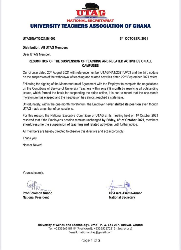 University Teachers Association of Ghana (UTAG), has called on its members to resume their suspended strike on Friday, October 8, 2021, over poor conditions of service.
