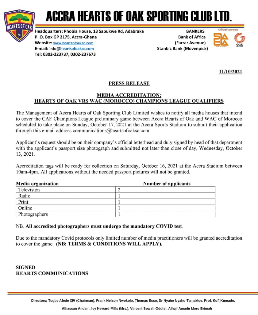 Ghana’s sole representative in the 2021 CAF Champions League campaign, Accra Hearts of Oak has opened media accreditation process for its upcoming game against Moroccan side, Wydad Athletic Club (WAC) Casablanca.