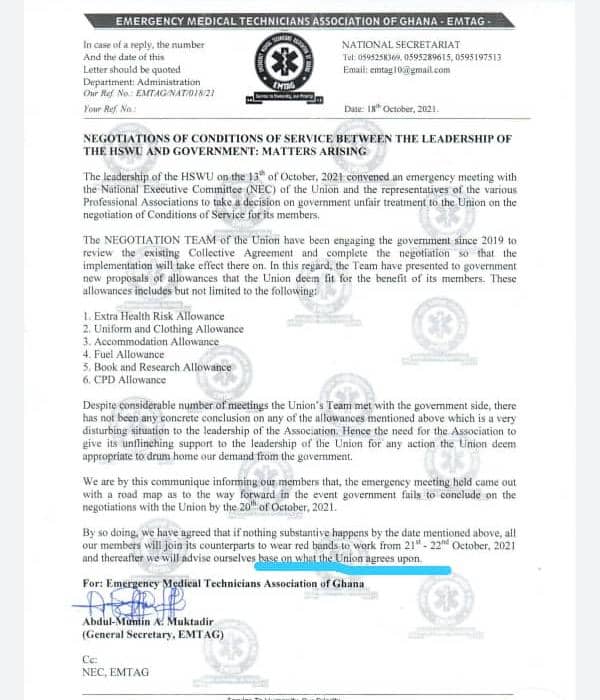 “By so doing, we have agreed that if nothing substantive happens by the date mentioned above, all our members will join its counterparts to wear red bands to work from 21st – 22nd October 2021 and thereafter we will advise ourselves base on what the union agrees upon” the statement signed by the General Secretary of EMTAG, Abdul-Mumin A. Muktadir added.
