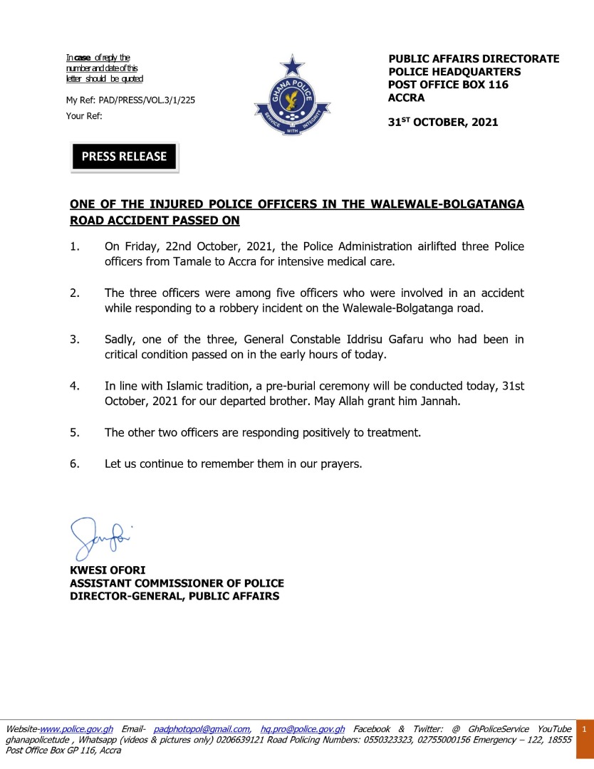 The Ghana Police Service has confirmed the sudden demise of one General Constable Iddrisu Gafaru who was involved in the Walewale-Bolgatanga road crash while on duty.