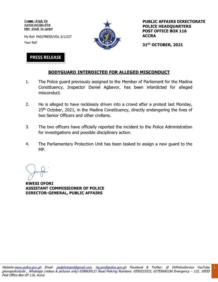 “He is alleged to have recklessly driven into a crowd after a protest last Monday, 25th October 2021, in the Madina Constituency, directly endangering the lives of two Senior Officers and other civilians” a statement issued by ACP Ofori who is Director-General of Public Affairs has said.