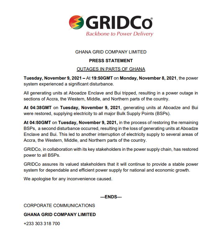 GRIDCo, in a statement issued on November 9, stated that “at 19:50GMT on Monday, November 8, 2021, the power system experienced a significant disturbance. All generating units at Aboadze Enclave and Bui tripped resulting in a power outage in sections of Accra, the Western, Middle and Northern parts of the country”