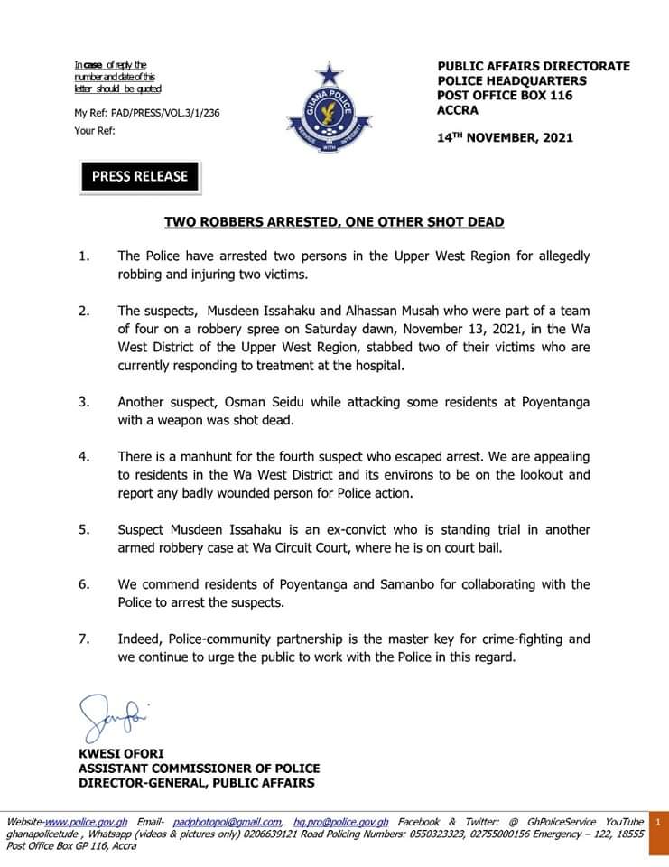 In a statement issued by the Police, it said the suspects, Musdeen Issahaku and Alhassan Musah were part of a gang of four on a robbery spree on Saturday dawn, November 13, 2021, in the Wa West District of the Upper West Region.