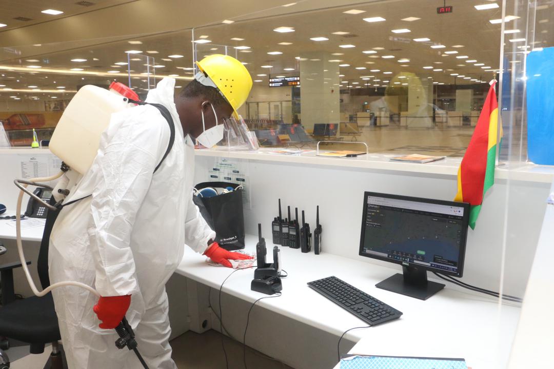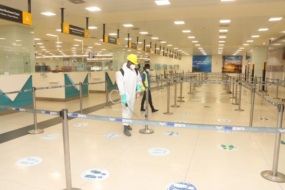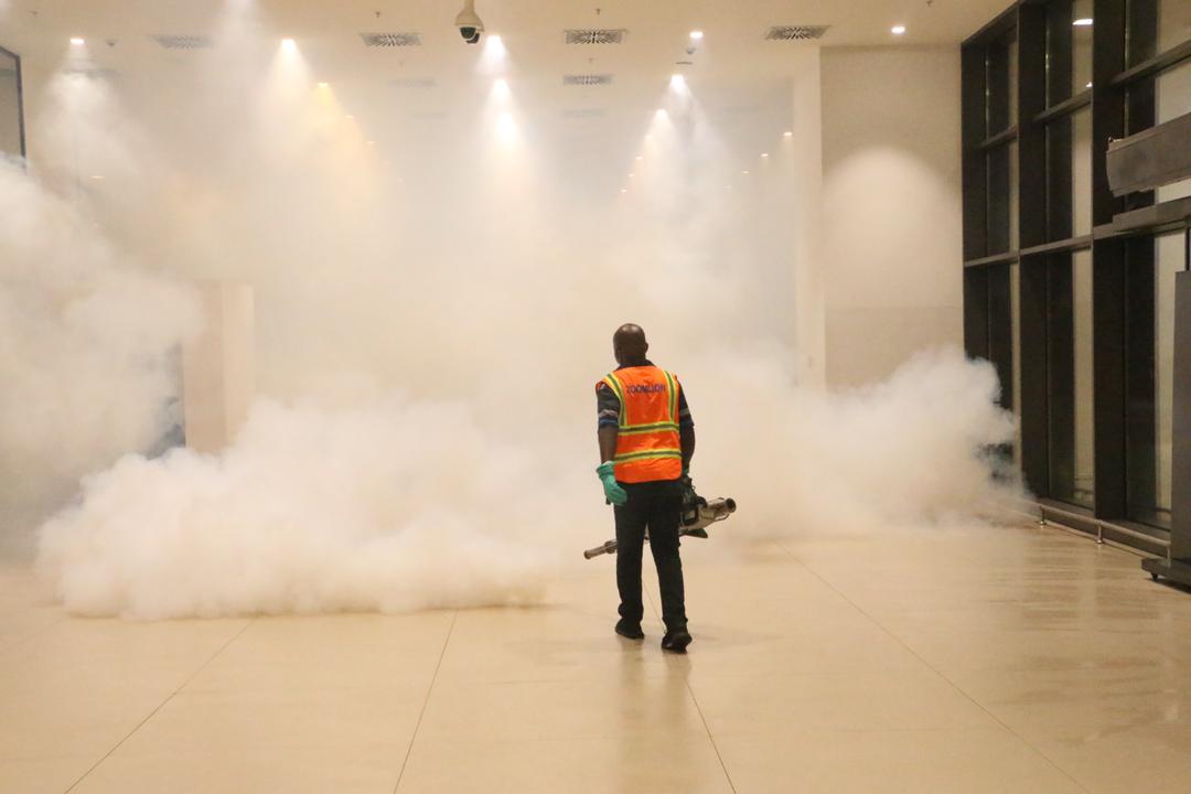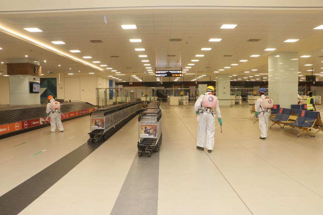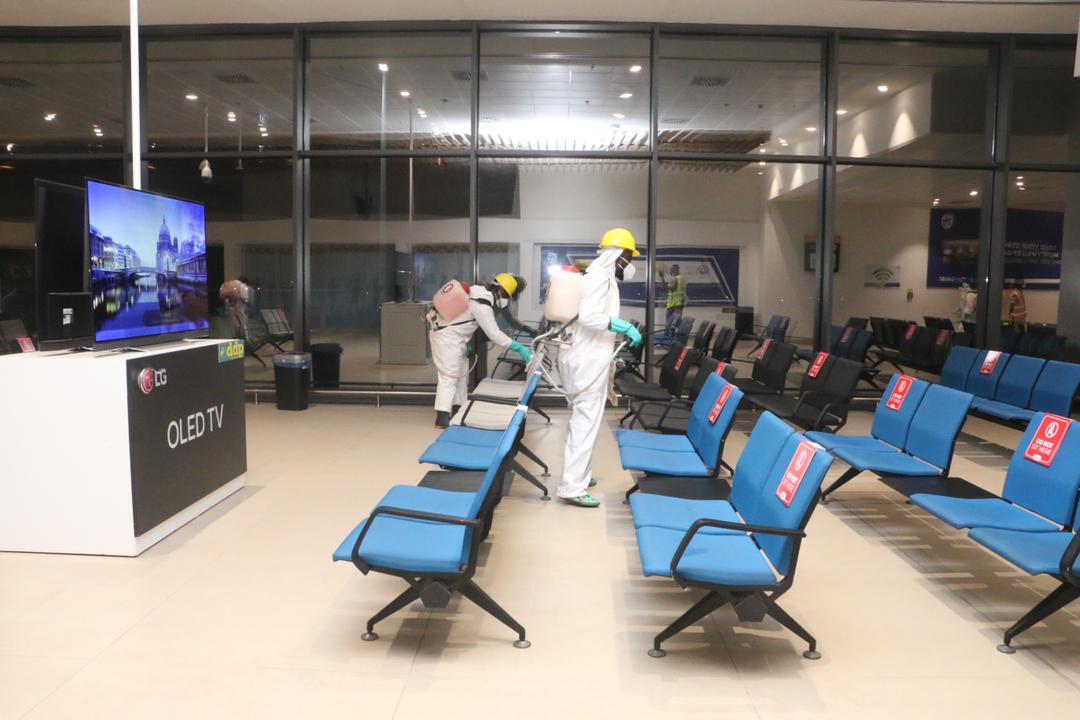 The monthly airports’ disinfection is a collaboration between the government and waste management company, Zoomlion.