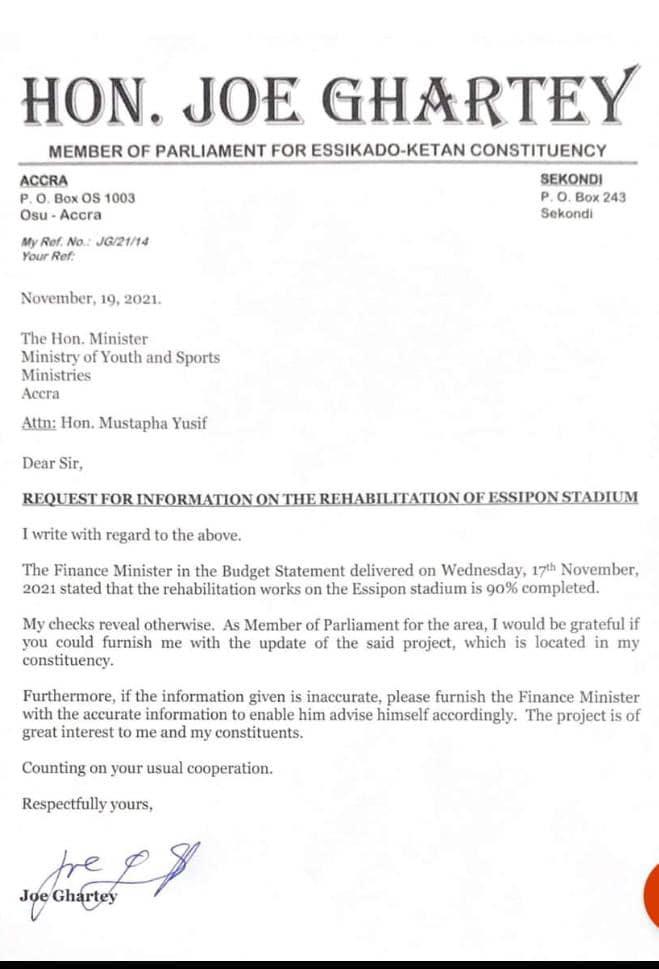 Member of Parliament (MP) for Essikado-Ketan Constituency in the Western Region, Joe Ghartey, is demanding from the Ministry of Youth and Sports, an update on the state of work on the Essipon Stadium in his constituency.