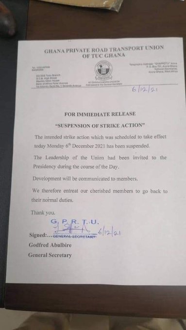 The over three-hour industrial action which was embarked upon on the morning of Monday December 6, 2021 was suspended following a call by PresidentNana Addo Dankwa Akufo-Addo, on the leadership of the coalition to engage them on their plight.