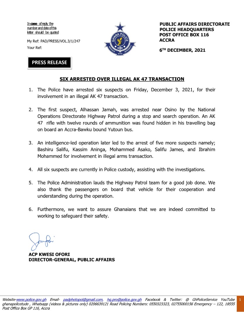 According to a police statement issued on Monday, December 6 by ACP Kwesi Ofori, the Director General in charge of Public Affairs, an intelligence-led operation later led to the arrest of five more suspects.