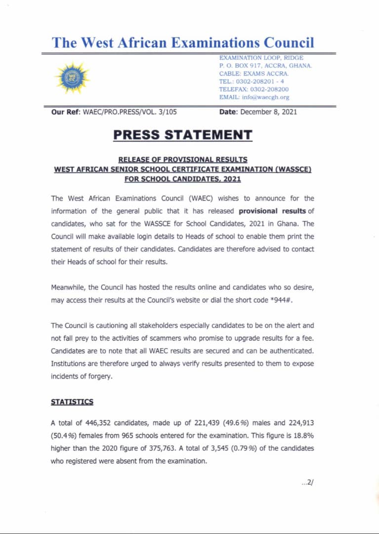A total of 446,352 candidates made up of 221,439 (49.6%) males and 224,913 (50.4%) females from 965 schools who sat for the 2021 WASSCE across the country.