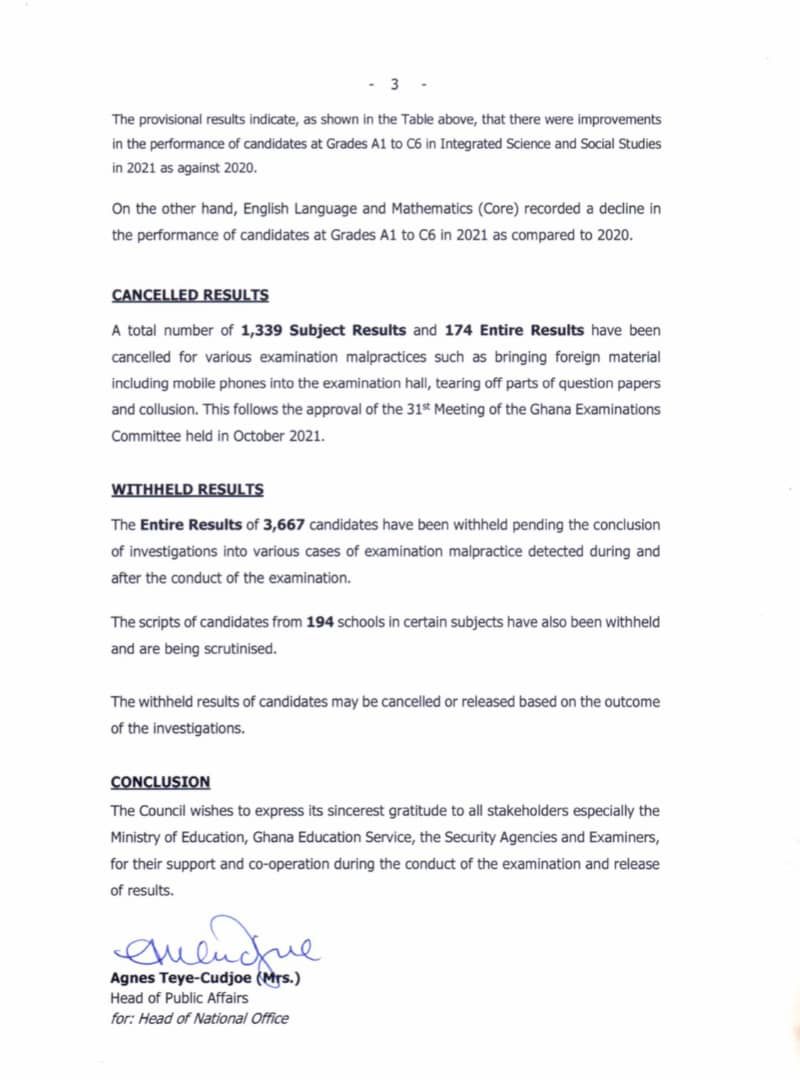 This was disclosed in a statement issued by WAEC as signed by its Head of Public Affairs, Mrs. Agnes Teye-Cudjo on Wednesday, December 8, 2021 to announce the release of the provisional examination results.