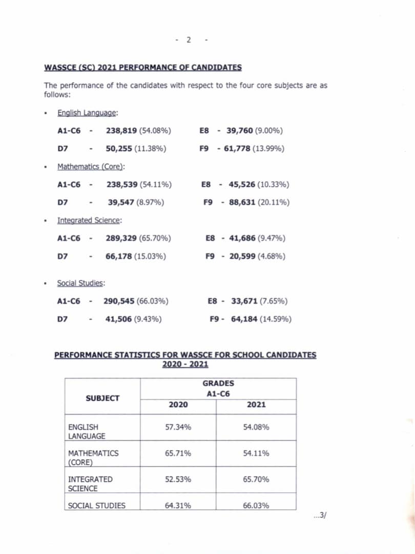 On the other hand, Social Studies and Integrated Science saw improvement in performance rate of candidates at grade A1-C6 with 66.03% and 65.70% in the 2021 examination as compared to the 64.31% and 52.53% in 2020.