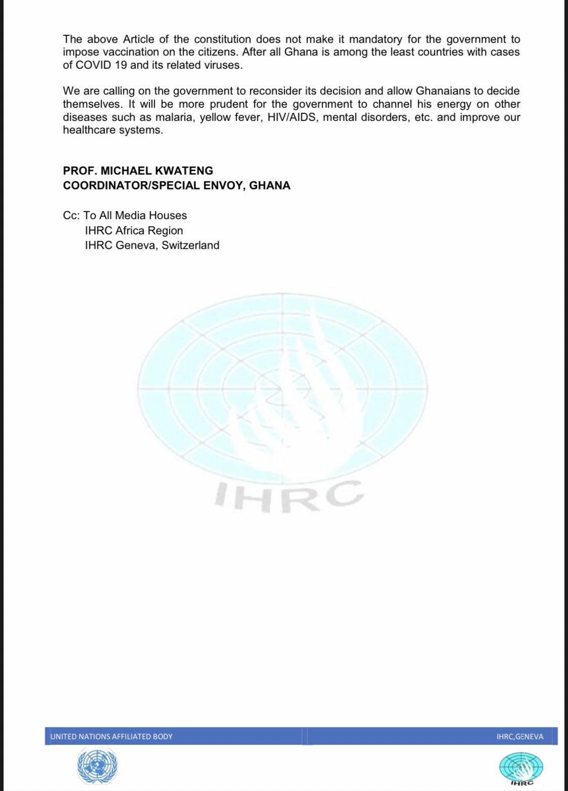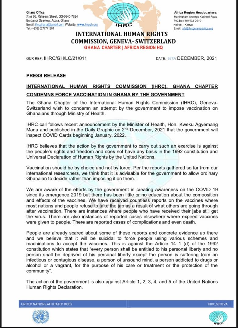 The Ghana Chapter of the International Human Rights Commission (IHRC), Geneva, Switzerland has condemned the attitude of government of Ghana for the imposition of the COVID-19 vaccination on its citizens.
