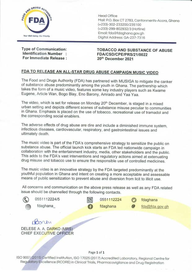 According to the FDA, the music-video set to be released within the week is a nationwide campaign that requires a collective effort to enable place emphasis on tobacco, tramadol and the corresponding social enablers.