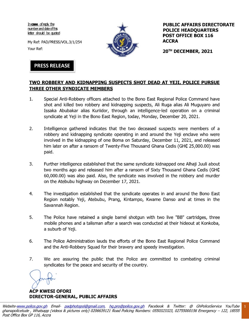 The two, Ali Ruga alias Ali Muguyaro and Issaka Abubakar alias Kuridor, were shot by a special Anti-Robbery unit from the Bono East Regional Police Command following an intelligence-led operation on a criminal syndicate at Yeji on Monday December 20, 2021.