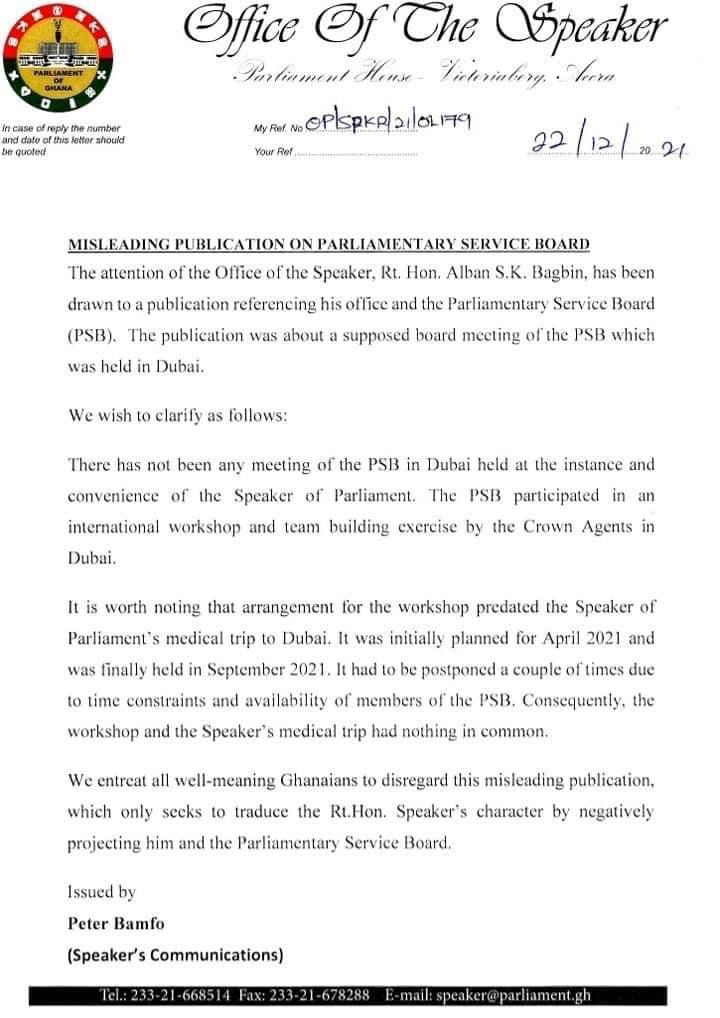 “We entreat all well-meaning Ghanaians to disregard this misleading publication, which only seeks to traduce the Rt.Hon. Speaker’s character by negatively projecting him and the Parliamentary Service Board.”