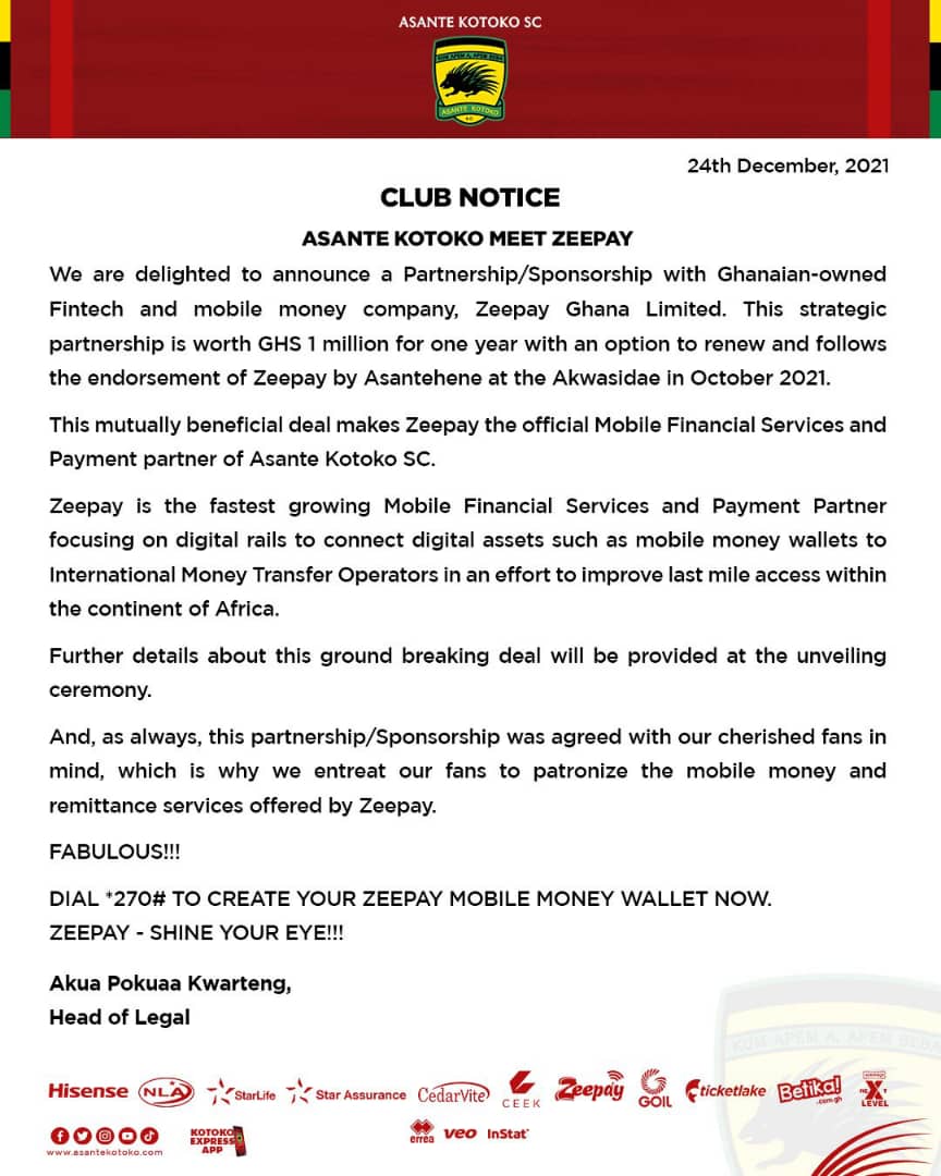 Ghana Premier League club, Kumasi Asante Kotoko, has announced a partnership deal with Zeepay Ghana Limited.