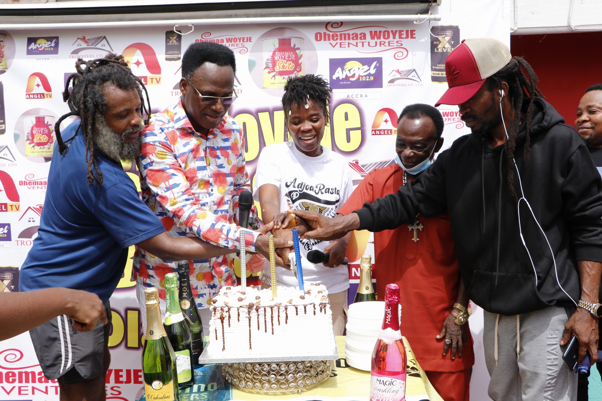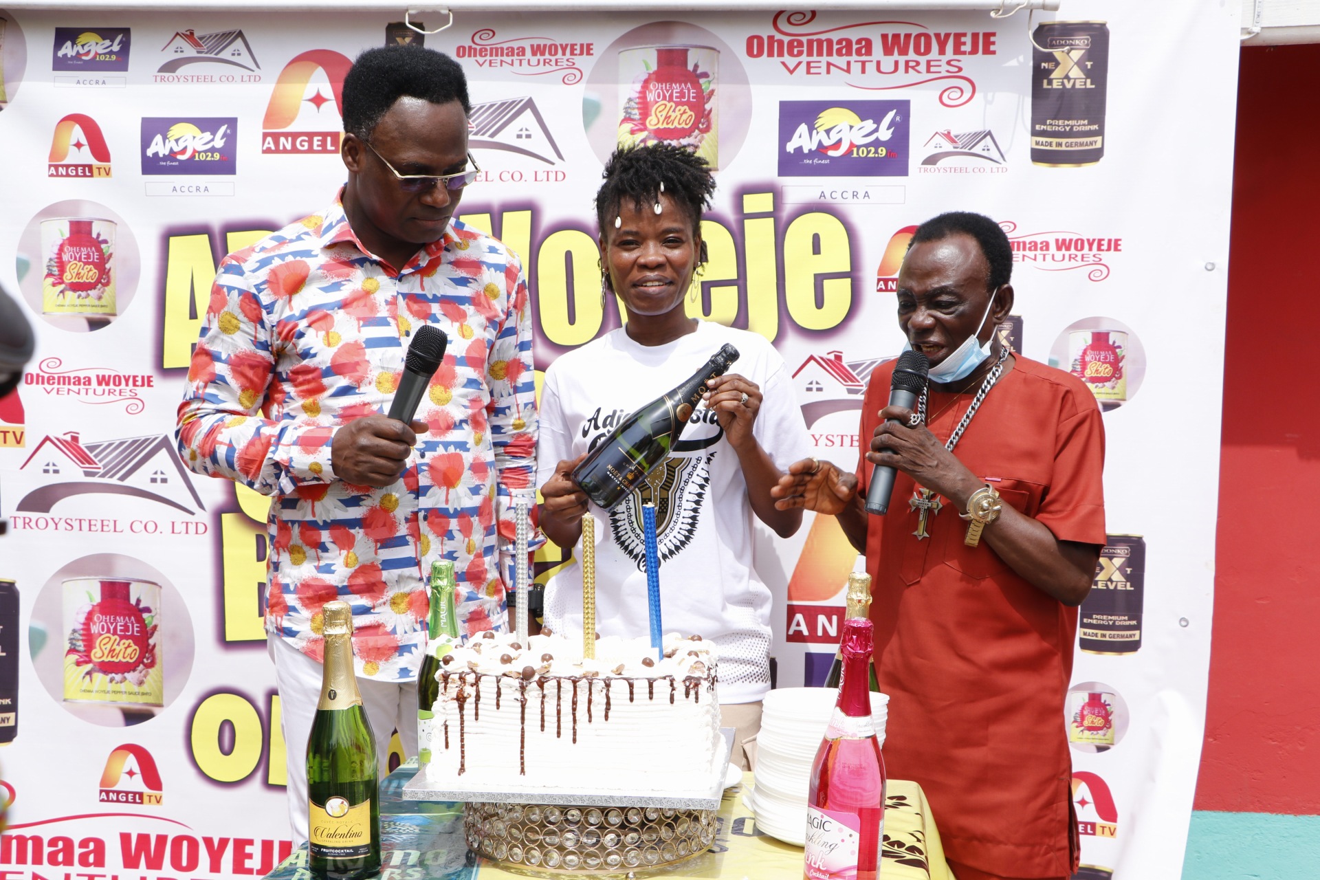 Ohema Woyeje joined by Prophet Francis Amoako-Atta and Obuoba J.A. Adofo to cut the birthday cake