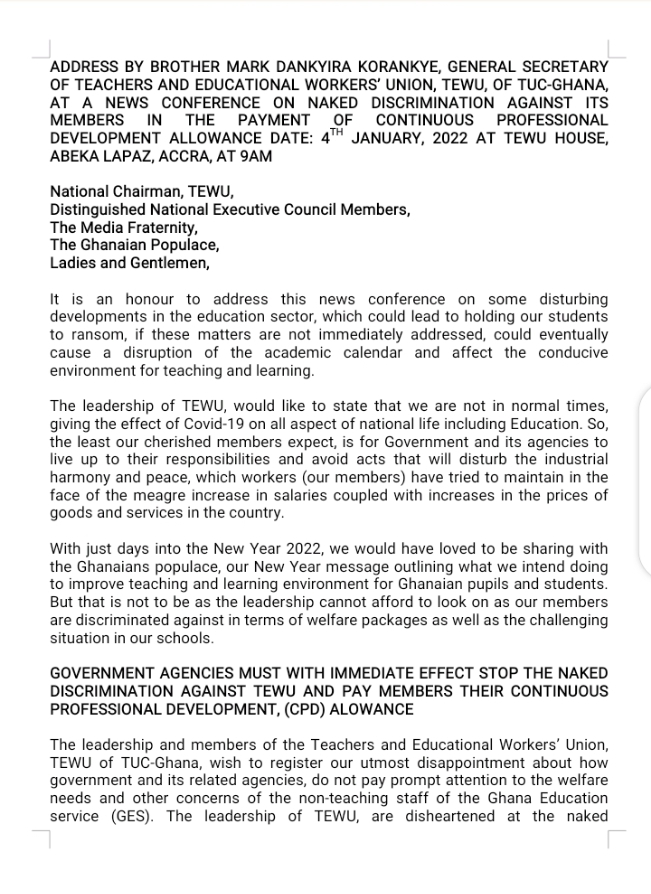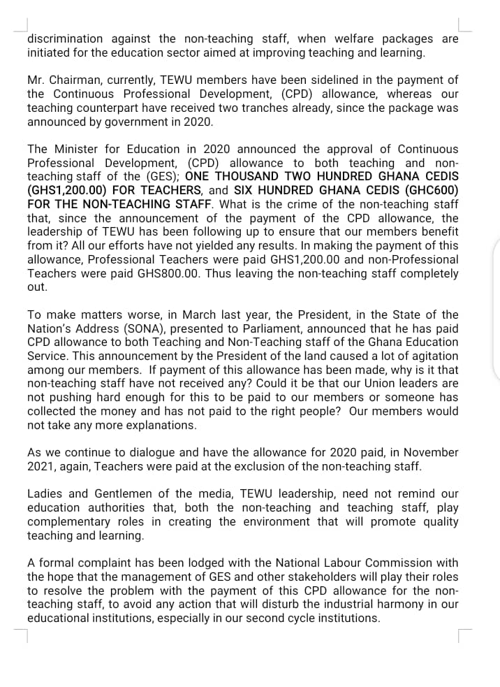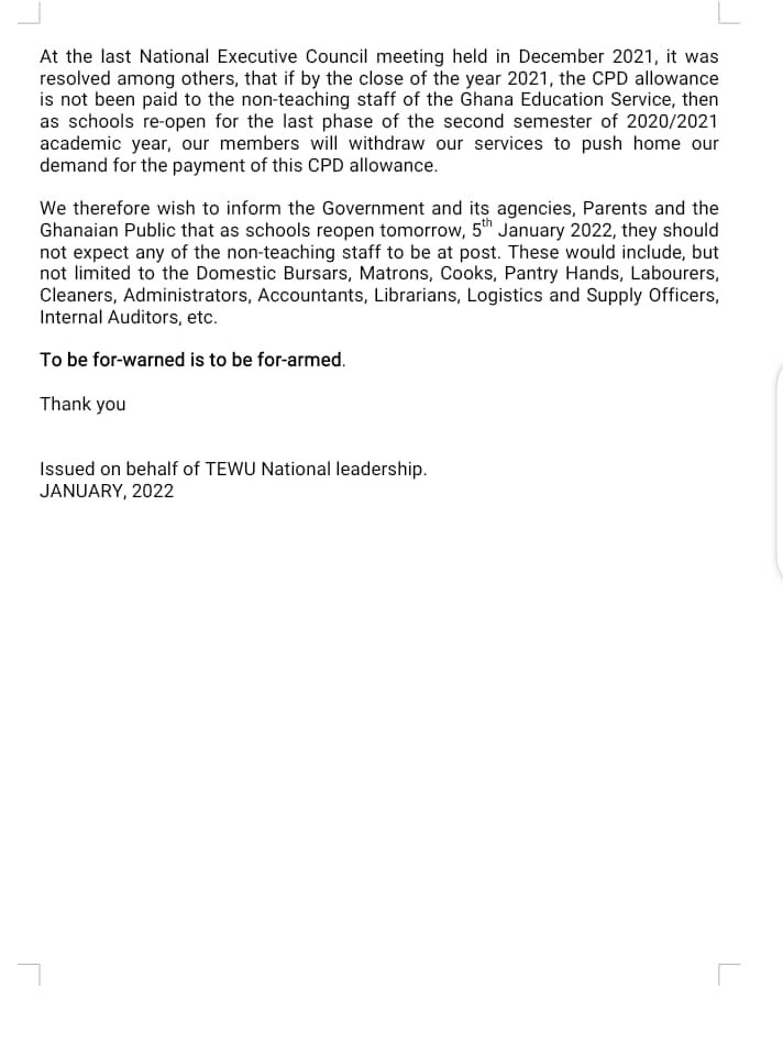 “At the last National Executive Council meeting held in December 2021, it was resolved among others, that if by the close of the year 2021, the CPD allowance is not been paid to the non-teaching staff of the Ghana Education Service, then as schools re-open for the last phase of the second semester of 2020/2021 academic year, our members will withdraw our services to push home our demand for the payment of this CPD allowance.”