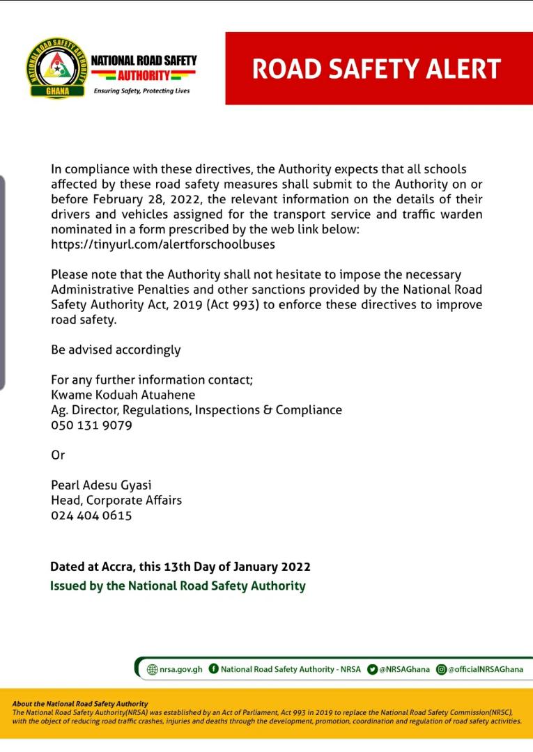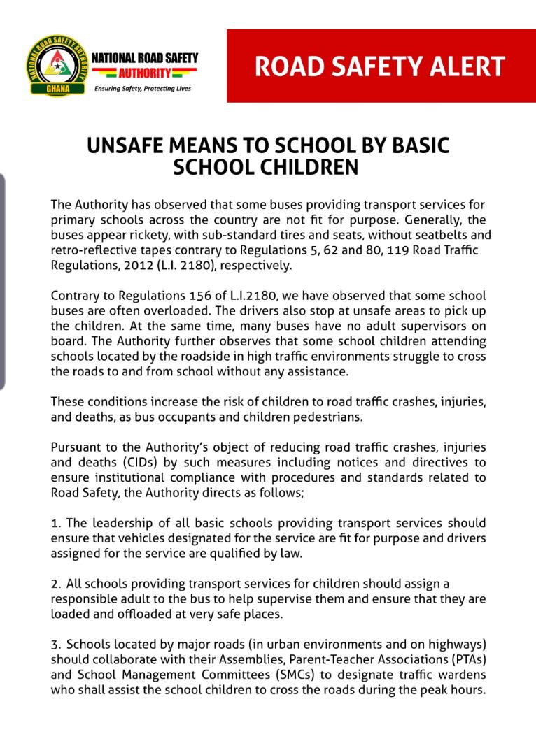 The National Road Safety Authority has directed authorities of primary schools providing transport services to ensure their vehicles are fit for purpose.