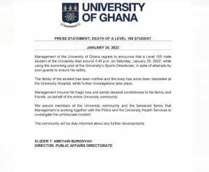 The University of Ghana (UG) has announced the commencement of an investigation into the death of a level 100 student.