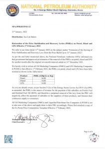 “We hereby wish to inform all Oil Marketing Companies (OMCs) and LPG Marketing Companies (LPGMCs) that effective 1st February, 2022, the PSRLs on petrol, diesel and LPG have been fully restored.”