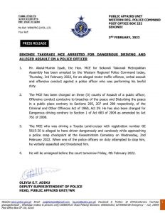 “The MCE, who was driving a Toyota Land-cruiser with registration number GE 5615-20 is alleged to have driven dangerously and carelessly while approaching a police snap check point at the Kwasimintsim Cemetery on Wednesday, 2nd February 2022. When one of the police officers on duty attempted to stop him, he verbally assaulted and threatened him” the communique added.