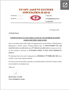 An initial strike declared on Tuesday, February 1, 2022 was halted after management of the facility offered to engage the leadership of the Komfo Anokye Doctors Association (KADA’s) on the matter.