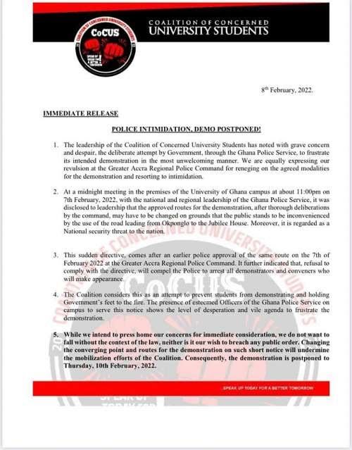 The planned demonstration scheduled to take place Tuesday, February 8, 2022, was to see students march to the Jubilee House and Parliament to get government address their concerns.