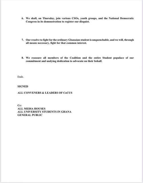 “We shall, on Thursday, join various CSOs, youth groups, and the National Democratic Congress in its demonstration to register our disquiet. Our resolve to fight for the ordinary Ghanaian students is unquenchable, and we will through all means necessary, fight for that common interest” part of the statement added.
