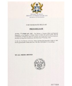“The Ministry of Foreign Affairs and Regional Integration of the Republic of Ghana wishes to inform the general public that the Government of Ghana has lifted the temporary travel restrictions on all non-Ghanaian travellers arriving from South Korea with effect from 4th February 2022″, said the statement.