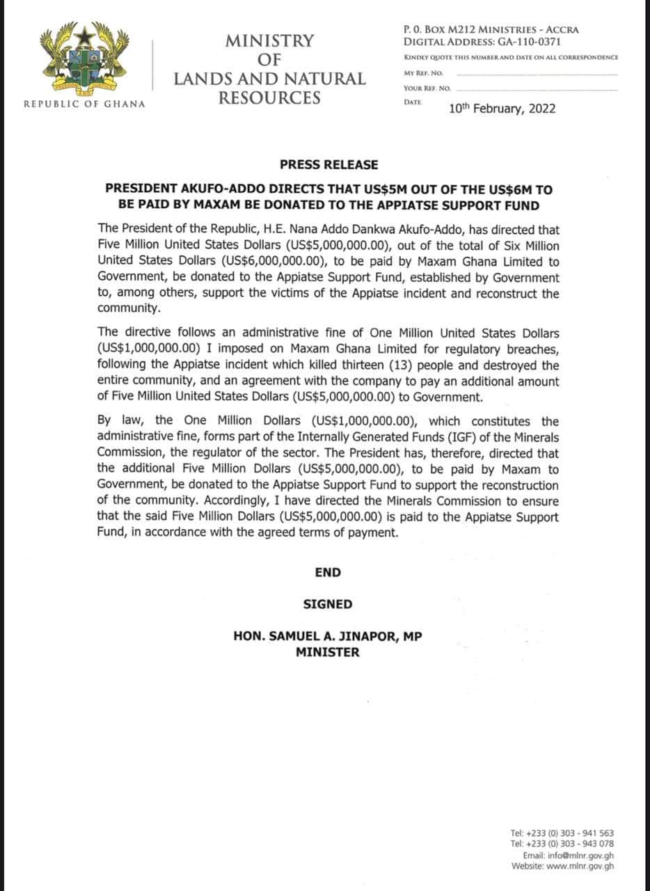 “The President has therefore directed that the additional Five Million Dollars (US$5,000,000.00), to be paid by Maxam to Government, be donated to the Appiati Support Fund to support the reconstruction of the community.”