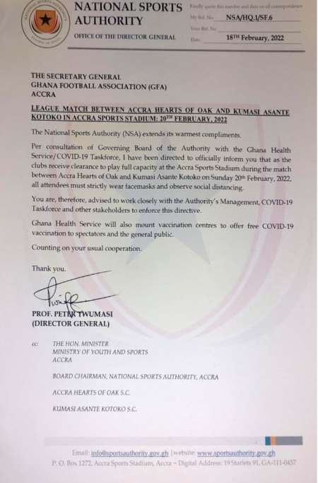 The statement signed by the Director-General of the NSA, Prof. Peter Twumasi, indicated; “as clubs receive clearance to play full capacity at the Accra Sports Stadium during the match between the Accra Sports Stadium and Kumasi Asante Kotoko on Sunday 20th February 2022, all attendees must strictly wear facemasks and observe social distancing.”