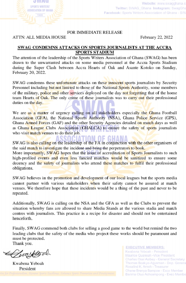 The Sports Writers Association of Ghana (SWAG) has condemned attacks on its members by security personnel, during last Sunday’s super clash between Hearts of Oak and Asante Kotoko at the Accra Sports Stadium.