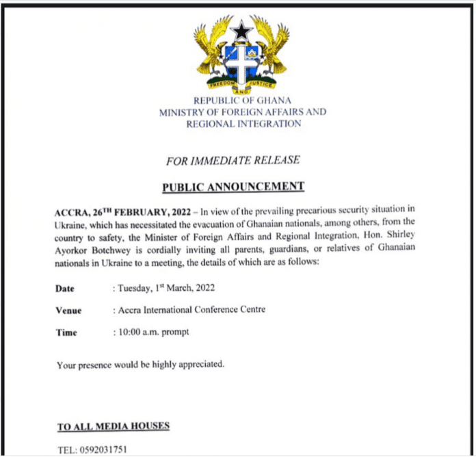 “In view of the prevailing precarious security situation in Ukraine, which has necessitated the evacuation of Ghanaian nationals, among others, from the country to safety, the Minister of Foreign Affairs and Regional Integration, Hon. Shirley Ayorkor Botchwey, is cordially inviting all parents, guardians, or relatives of Ghanaian nationals in Ukraine to a meeting,” the Ministry said.