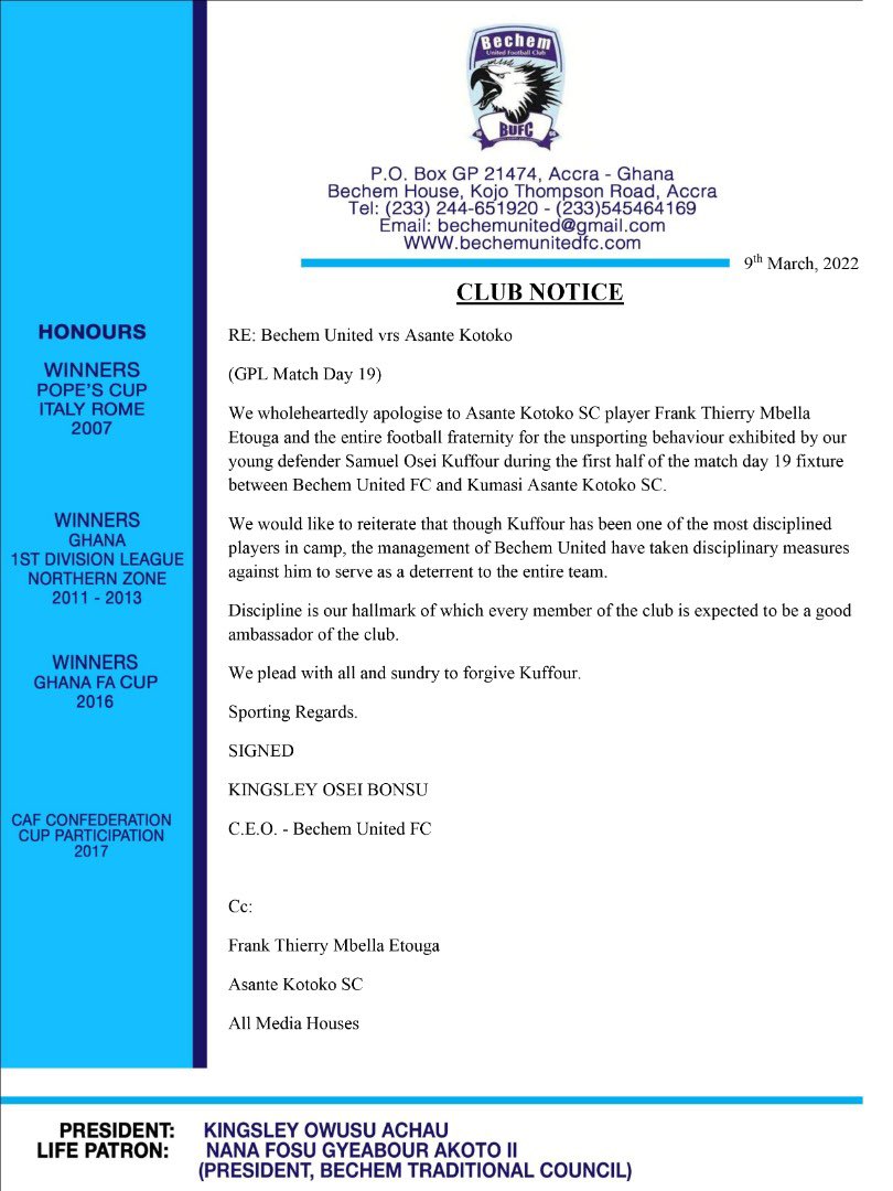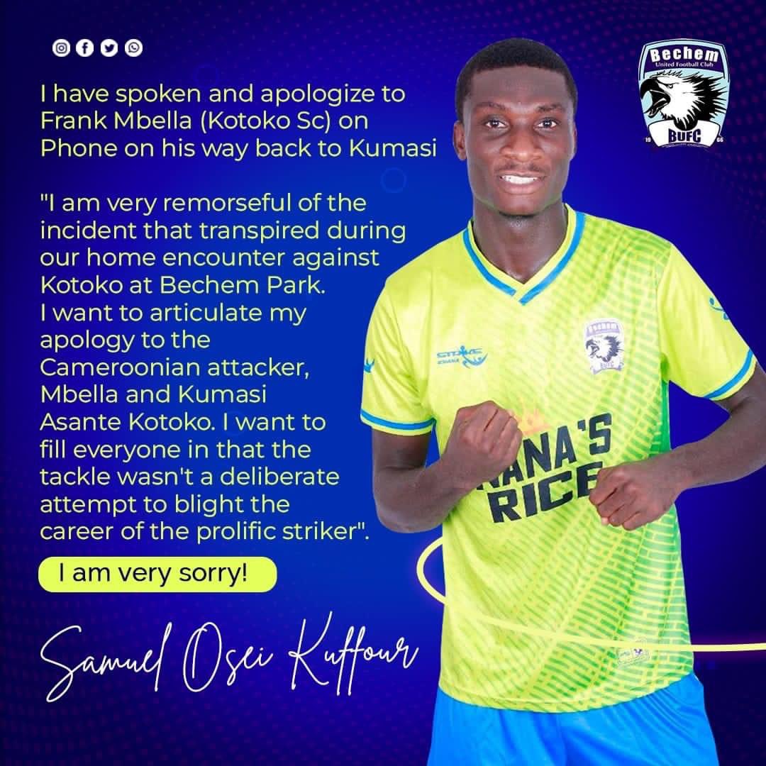 Ghana Premier League, Bechem United side has rendered an apology to Kumasi Asante Kotoko following an unsporting behavior exhibited by their player Samuel Osei Kuffour towards Frank Etouga Mbella.
