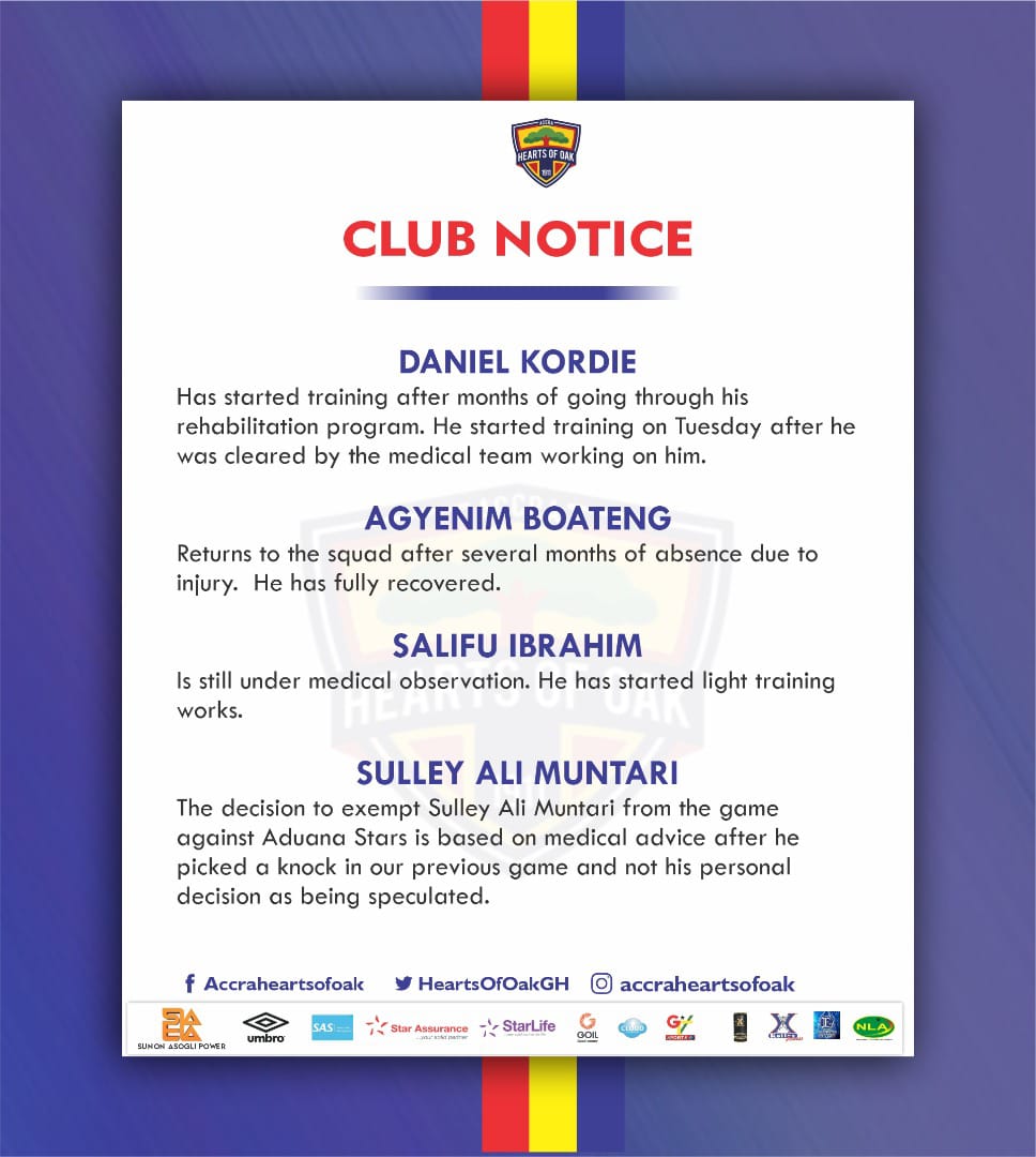 “The decision to exempt Sulley Ali Muntari from the game against Aduana Stars is based on medical advice after he picked a knock in our previous game and not his personal decision as being speculated,” Accra Hearts of Oak stated.