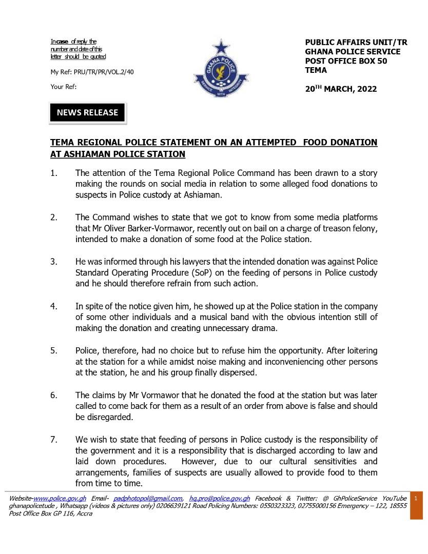 A statement signed by Head of Public Affairs in Tema, Chief Inspector Stella Dede Dzakpasu, explained that  Mr. Barker-Vormawor was informed through his lawyers his initiative was against Police Standard Operating Procedure (SoP), therefore, was advised to refrain from carrying out the said donation.