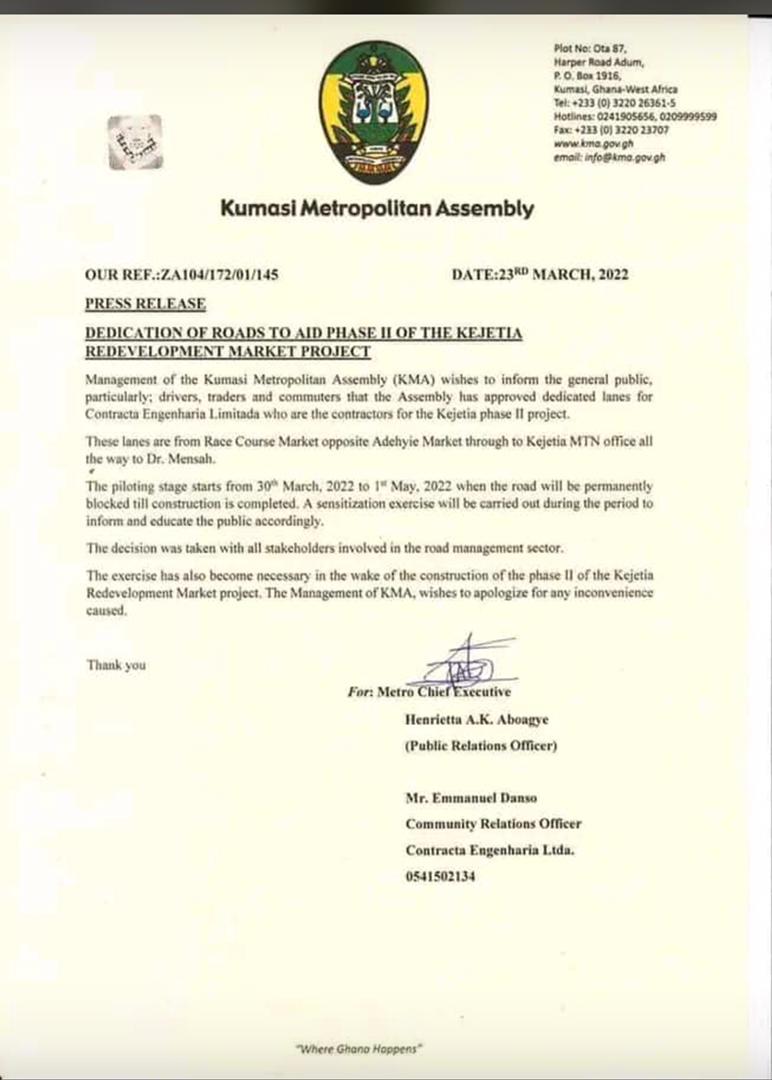 “Management of the Kumasi Metropolitan Assembly (KMA), wishes to inform the general public, particularly; drivers, traders and commuters that the Assembly has approved dedicated lanes for Contracta Engenharia Limitada who are the contractors for the Kejetia phase II project”