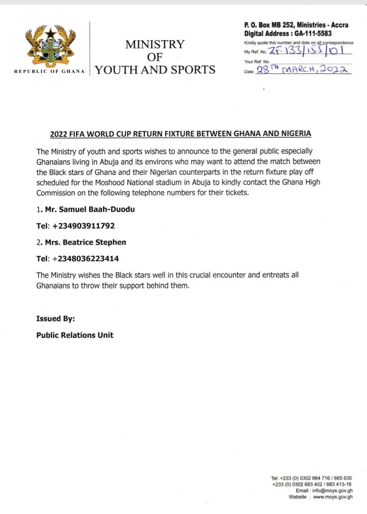 In a presser, the Sports Ministry urged Ghanaians who want to attend the match are required to get in touch with the Ghana High Commissioner, Samuel Baah-Duodu for their tickets.