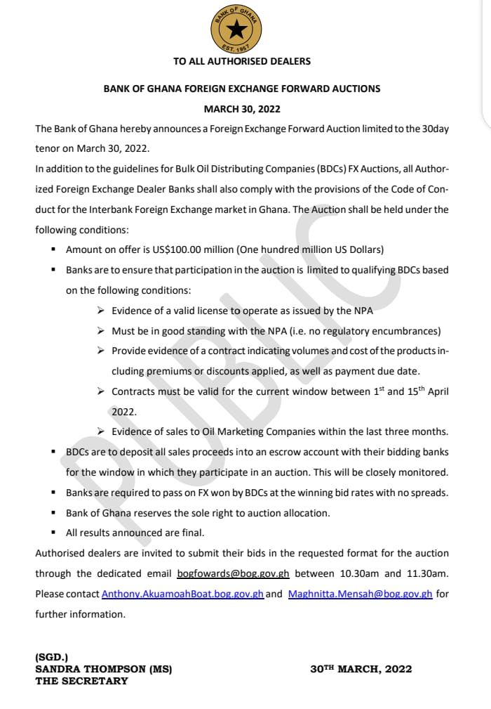 All authorised dealers are to submit their bids in the requested format for the auction through the dedicated email bogforwards@bog.gov.gh between 10.30am and 11.30am.