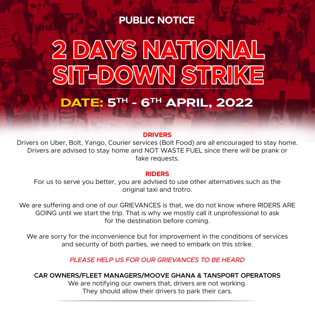 Drivers with ride-hailing companies, Bolt, Uber and Yango in the country, have declared a two-day nationwide sit-down strike over poor service conditions.