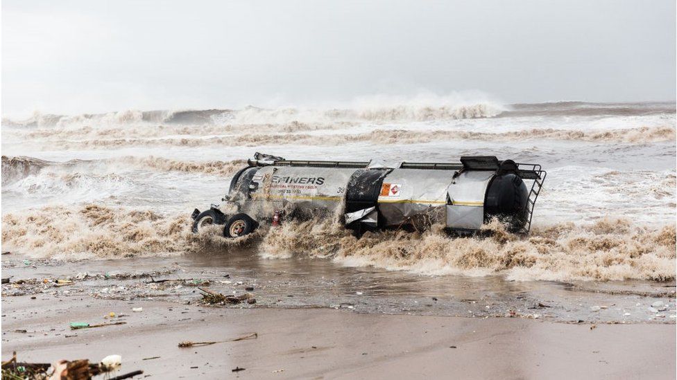 In an industrial area called the Bluff, which forms part of the port, the BBC witnessed cars overturned on the road, or crushed by debris. Companies are using water pumps to drain the water from their premises.